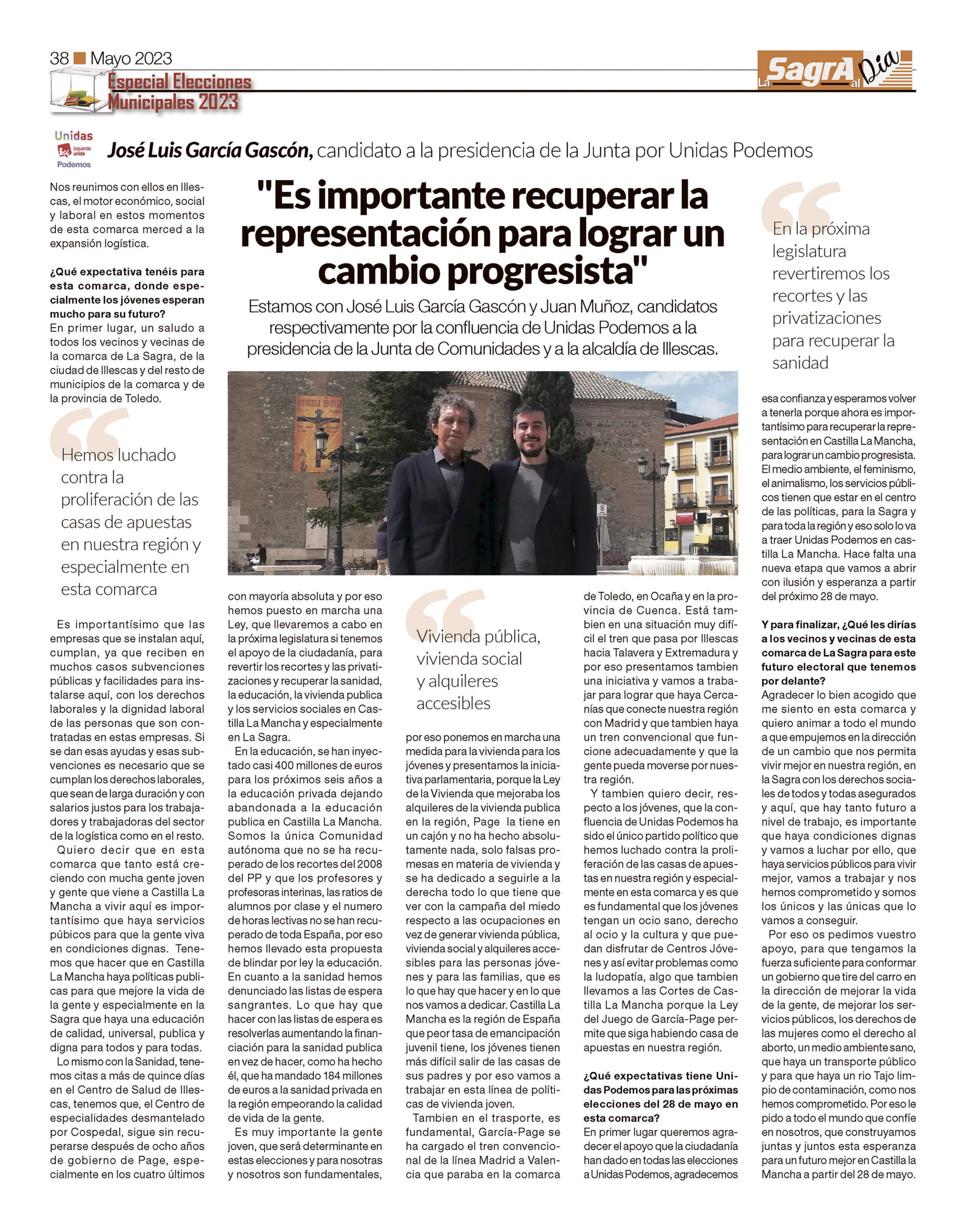 La Sagra al Día os invita a que conozcáis un poco más a muchos de los candidatos que se presentan en los municipios sagreños. Aquí tenemos entrevistas a algunos de los principales candidatos y candidatas de la comarca con sus respectivos proyectos de cara a la próxima legislatura. incluimos, también, una interesante entrevista que le hicimos al candidato de Unidas Podemos a la presidencia de Castilla-La mancha, José Luis García Gascón, durante una visita que hizo a Illescas para acompañar al candidato de la formación en la localidad Juan Muñoz.