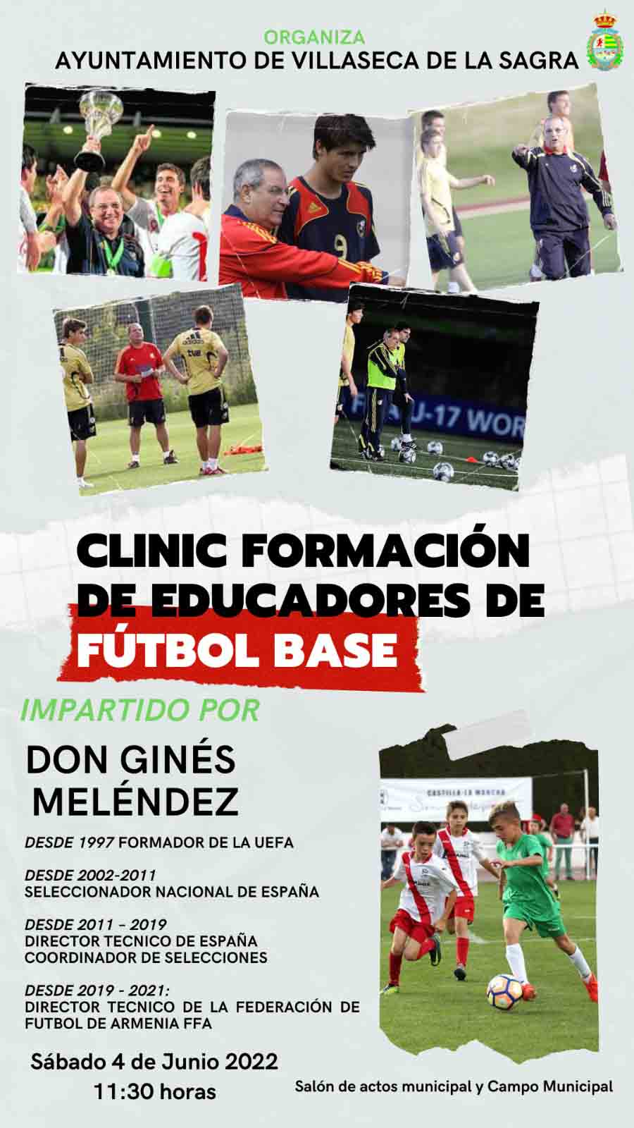 Como actividad complementaria al “XXIV Campeonato de Fútbol Benjamin” La Sagra Decano de la Región se realizará en la jornada de mañana del sábado 4 de junio de 2022 un “Clinic de Formación de Educadores de Fútbol Base” impartido por Ginés Meléndez Sotos que se iniciará a partir de las 11:30 horas la primera parte teórica bajo el título “La evolución de la formación del fútbol base” en el salón de actos municipal pasando posteriormente a las instalaciones deportivas del Campo Municipal de Fútbol para realizar sesiones prácticas bajo el título “Prácticas en la iniciación de la enseñanza del Fútbol Base”.