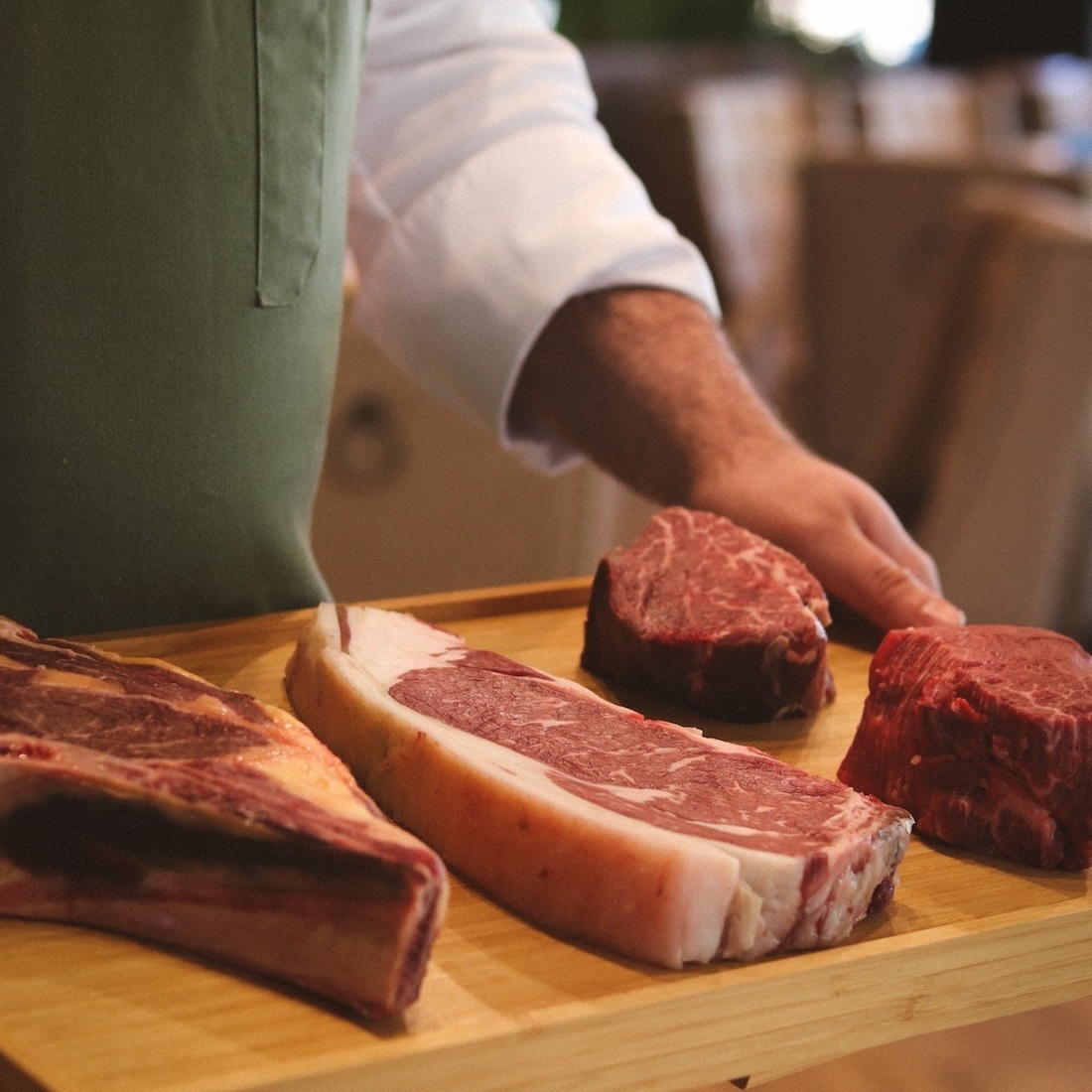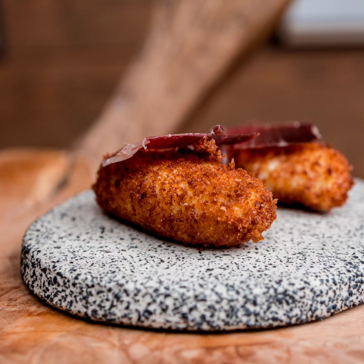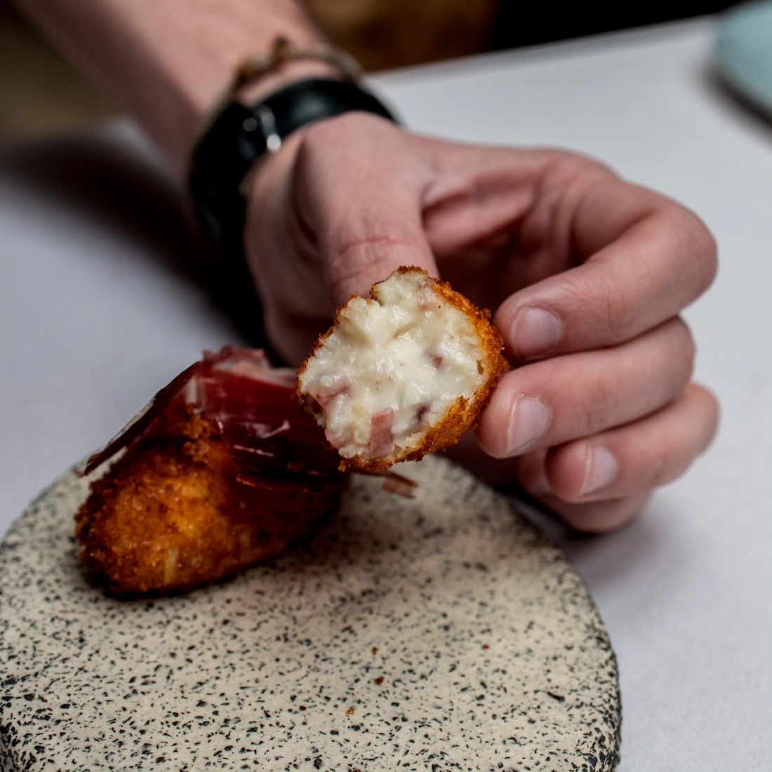 Platos icónicos como los torreznos, el jamón ibérico o las croquetas no pueden faltar. Su oferta de pescados a la parrilla, una de las señas de identidad de Essentia y en cuanto a la carne, Navarro deleita al comensal con propuestas como las chuletillas de cordero, el solomillo de vaca rubia gallega o la chuleta de vaca vieja madurada.