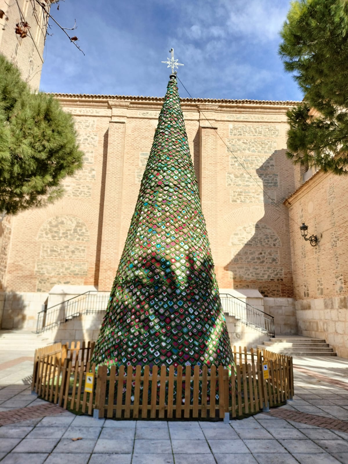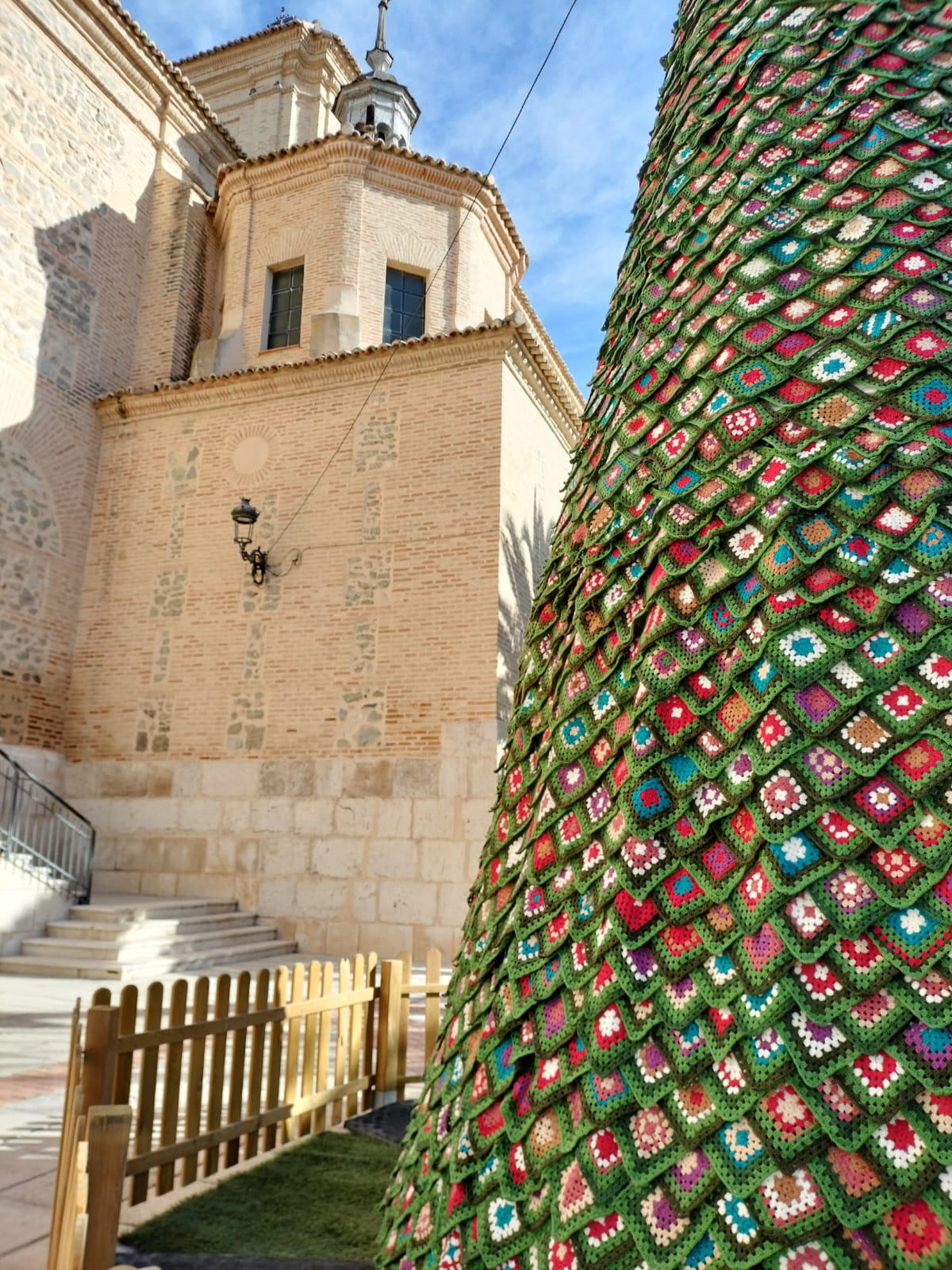 ¡Y lo han conseguido con matrícula de honor! Algo más de 3.800 grannys componen el laborioso y colorido traje de gala que cubre al Majestuoso Árbol de Navidad que preside el Km 0 de Alameda de la Sagra. Incluso han elaborado, a crochet, bellas cajas regalo para adornar y ambientar el entorno de Renato Tirolato Gazpachín, una vez luzca altivo, iluminado y fresco.
