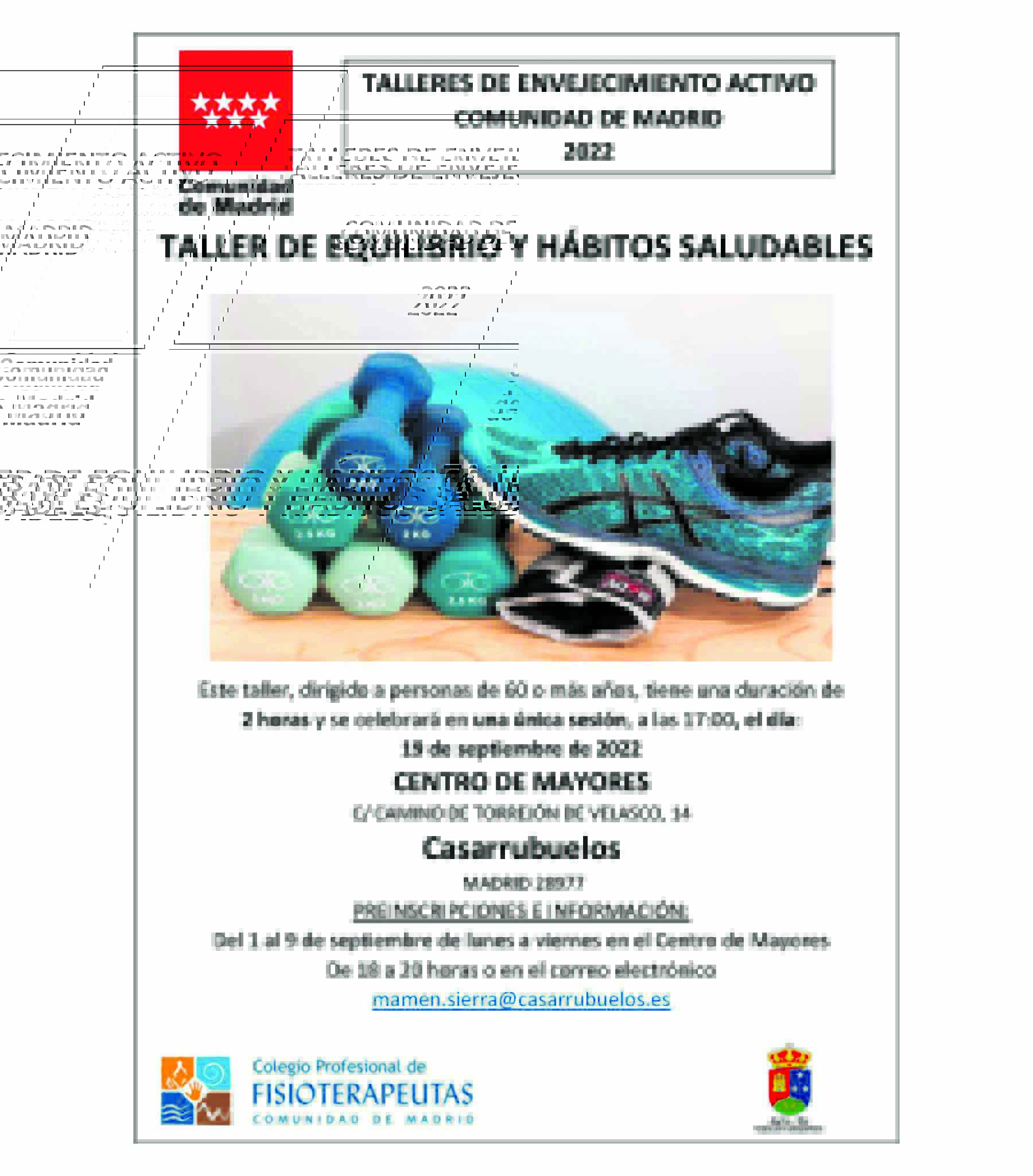 Taller de equilibrio y hábitos saludables para mayores en Casarrubuelos y deportes para el resto. El Ayuntamiento de Casarrubuelos ya tiene todo preparado para el próximo Taller de equilibrio y hábitos saludables para mayores en Casarrubuelos. Este taller de envejecimiento activo, está dirigido a personas de 60 o más años y tiene una duración de 2 horas. Se celebrará en una única sesión el día 19 de septiembre de 2022 a las 17:00h en el Centro De Mayores (C/ Camino de Torrejón de Velasco, 14. Casarrubuelos). Las preinscripciones fueron hasta el 9 de septiembre, de lunes a viernes en el Centro de Mayores o en el correo electrónico mamen.sierra@casarrubuelos.es, a donde podéis acudir si tenéis más dudas.