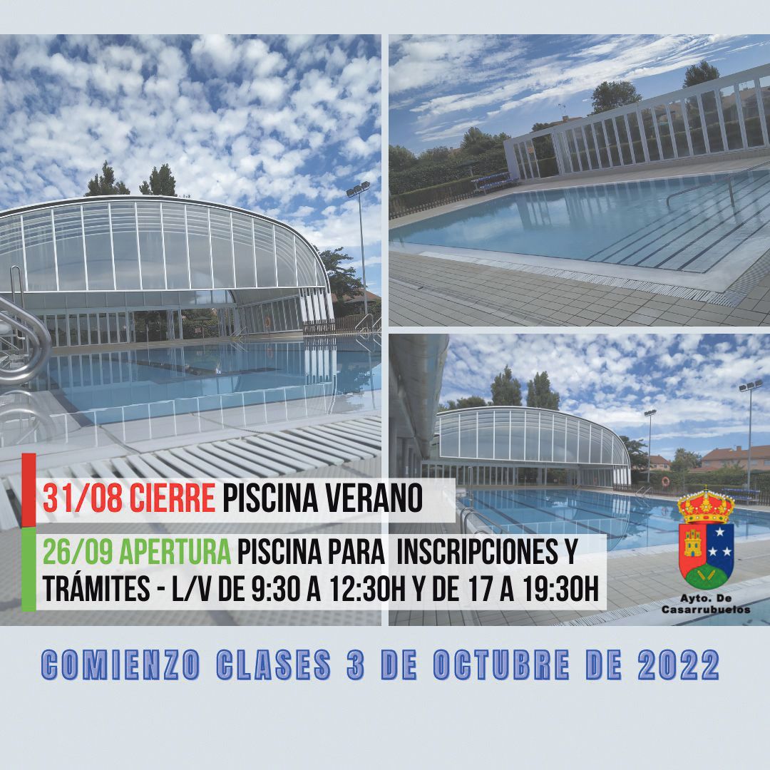 La piscina municipal de Casarrubuelos permanecerá cerrada del 1 al 25 de septiembre inclusive. Desde el día 26 de septiembre se abrirá en horario de 9:30 a 12:30h y de 17 a 19:30h solo para realizar inscripciones y trámites administrativos. El inicio de la temporada de invierno y los respectivos cursos empezarán el próximo día 3 de octubre de 2022.