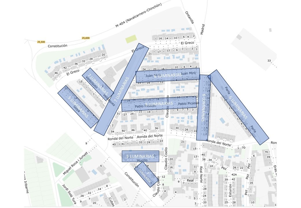 Las calles que se beneficiarán de esta mejora en la iluminación son: José Serrano, Federico Moreno Torroba, Francisco Alonso, Tomás Bretón, Ruperto Chapí, Federico Chueca, Parla, Madrid, Pablo Picasso, Juan Miró, Espina y Capó, Velázquez, Goya, Zurbarán, Murillo, Los Frailes y Arroyo. Además, el proyecto incluye la renovación de la iluminación del Parque Francisco Alonso.